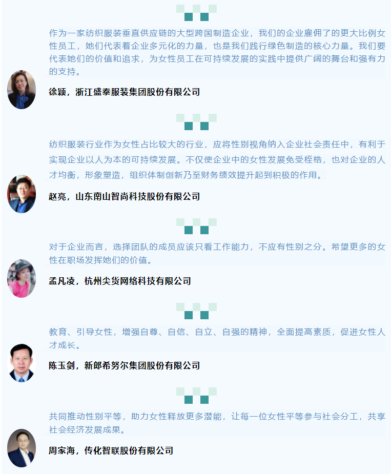 經過為期半年的推廣行動,近百家紡織服裝企業簽署了CEO聲明。這體現了紡織行業的企業家對性別平等的承諾,對履行企業社會責任的態度和擔當;同時,也反映出企業家們深刻認識到女性經濟賦權與性別平等文化構建的重要性,以及企業可以通過創造體面的工作機會、推動同工同酬、縮小性別差距帶來積極的影響。