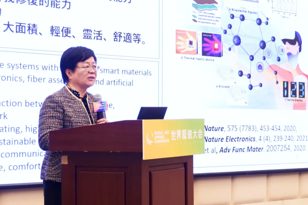 香港理工大學智能穿戴系統研究院教授陶肖明作《智能服飾的應用現狀和展望》報告。陶肖明指出,從紡織服裝全生命周期要求來看,功能材料需要向綠色安全化方向發展,例如加強研發生物基和可降解纖維材料,通過物理或機械方法實現無水或少水印染等。當前服飾應用范圍已經從傳統時尚擴大到健康、醫療、機器人、元宇宙等各方面,未來服裝供應鏈將向著設計智能化、生產自動化、評測數字化的方向發展。另外她強調,智能可穿戴設備實現的關鍵因素是先進功能面料的研發與應用,紡織與微電子兩大產業要加強合作,達到高性能、高可靠性、低成本、可量產化的目標,實現功能器件與紡織結構異質異構集成化發展。
