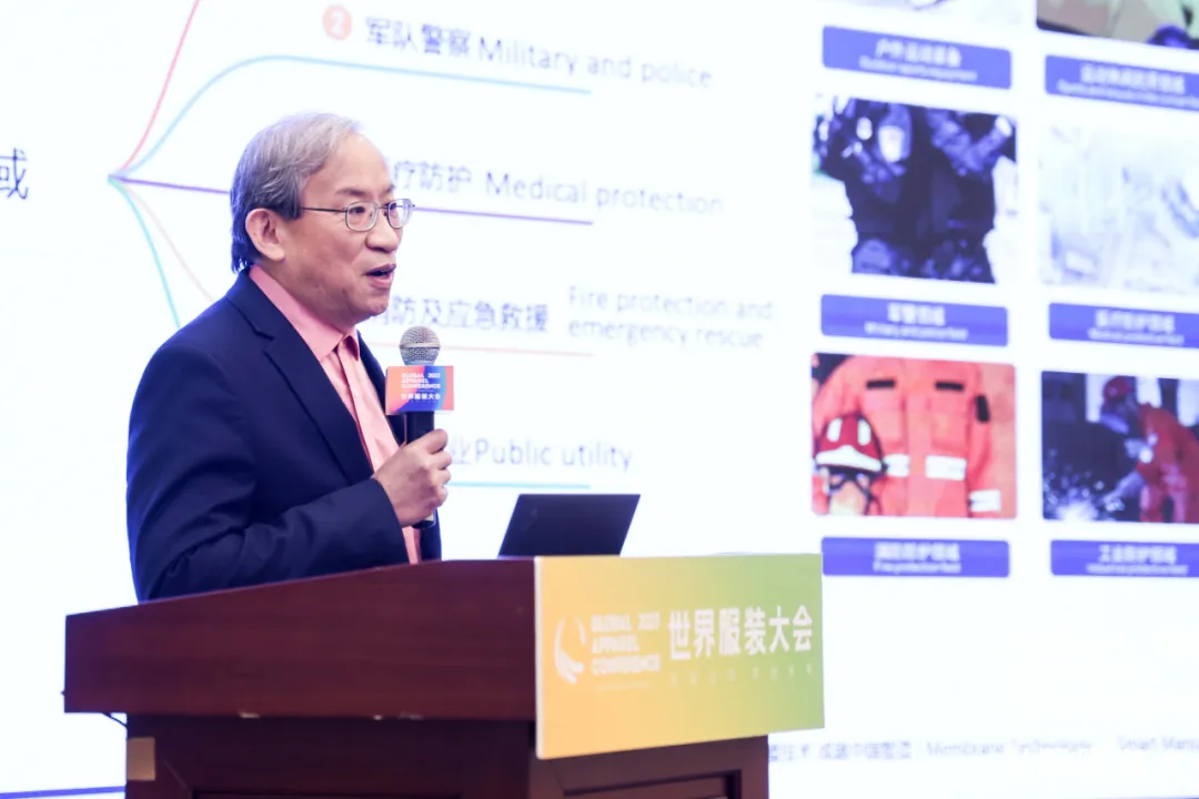 國家高層次人才、膜材料專家、上海漢丞實業有限公司董事長吳慧生作《功能性防護膜材料在紡織服裝行業應用現狀和趨勢研究》報告。吳慧生介紹,當前紡織服裝膜材料的應用場景主要包括大眾消費、軍隊警察、醫療防護、消防及應急救援、公共事業等方面,未來應用場景將更加廣泛。他簡要介紹了紡織服裝膜材料發展歷史,并指出紡織服裝膜材料未來會朝著舒適性、時尚性、科技性、耐候性、耐化性、環保性的方向發展。他強調,紡織服裝膜材料要加強與納米材料、氣凝膠、石墨烯等新材料的融合創新,并積極研發具有防風防雨、舒適透氣、阻燃抗菌、耐化耐候等多功能的紡織服裝膜材料。