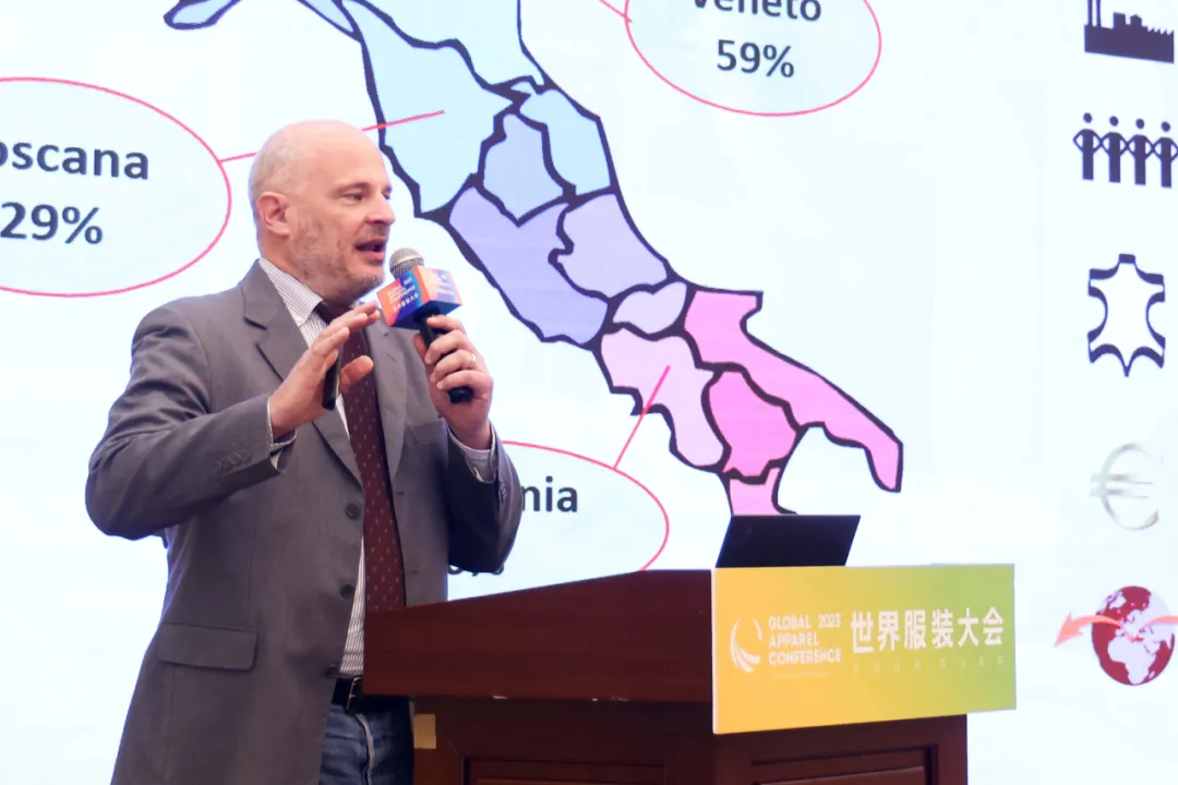 意大利琳瑯沛麗皮革協會CEO GIACOMO MARIA ZORZI作《服裝款式設計與面料的選擇匹配研究》報告。GIACOMO MARIA ZORZI簡要介紹了UNIC意大利制革行業貿易協會、ICEC皮革供應鏈業務認證機構、LINEAPELLE展覽會,其中LINEAPELLE是國際重要的皮革、配件、組件、面料、合成材料、鞋類展覽會。他指出,世界主要時尚和設計品牌都了解意大利模式,并認可其價值。他指出,風格創新是服裝款式設計的第一要素,意大利體系的優勢在于具有材料、技術和性能方面的創新能力,能確保客戶找到滿足風格要求的高水平產品。另外,綠色轉型也是服裝產業必須考慮的問題之一,在意大利有些公司已經能夠在染色階段將耗水量減少50%以上,有力促進了意大利紡織服裝業的可持續發展。