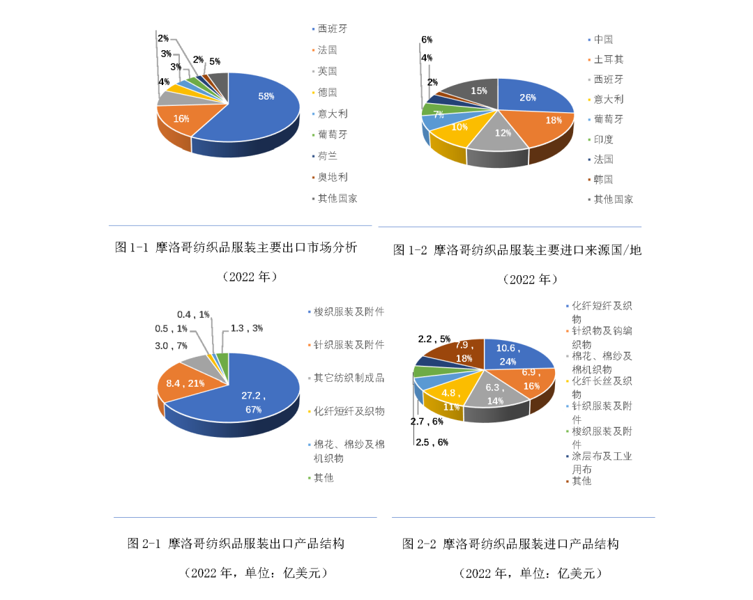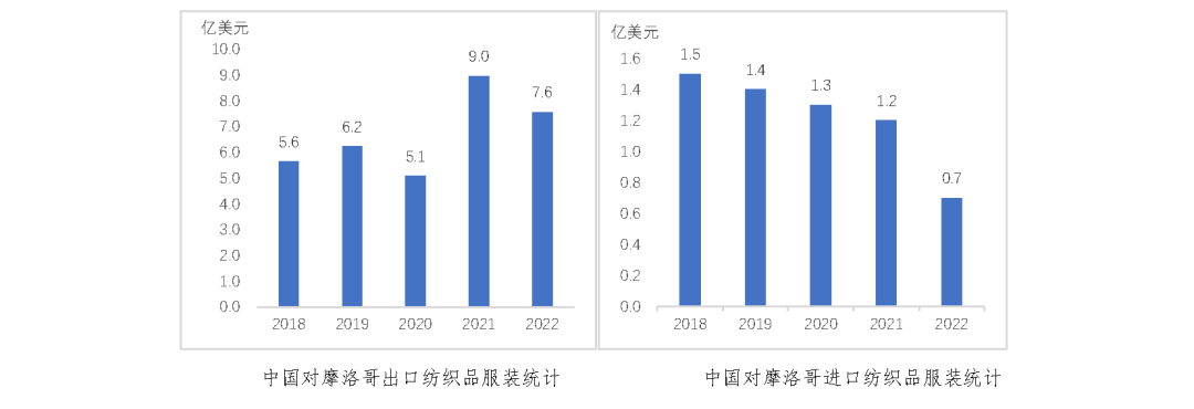 摩洛哥是首個加入“一帶一路”的馬格里布聯(lián)盟國家,在“一帶一路”倡議引領下,中摩兩國經貿合作不斷發(fā)展。當前,摩洛哥是中國在非洲的第十大貿易伙伴,中國是摩洛哥第三大貿易伙伴、第二大進口來源國。根據中國海關統(tǒng)計,2022年中摩雙邊出口及進口貨物貿易額分別為57.4億美元和9.1億美元,其中紡織品服裝出口額及進口額分別占中國對摩出口及自摩進口貿易額比重的13.2%和7.8%。