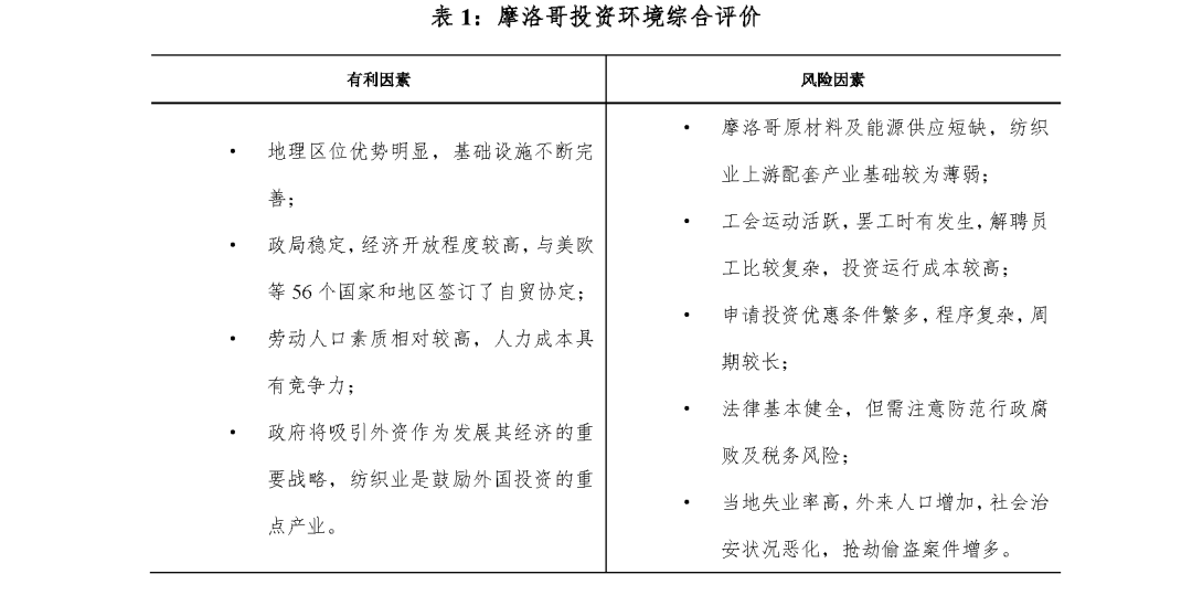(2)紡織服裝業(yè)是摩洛哥重要的傳統(tǒng)支柱產業(yè),主要面向歐洲市場,與一些國際品牌具有良好采購合作關系。與歐盟和美國均簽有自貿協(xié)定,紡織服裝產品享受零關稅進入歐美市場優(yōu)惠,有條件成為中國紡織服裝企業(yè)通過海外布局進入歐美市場的平臺。
