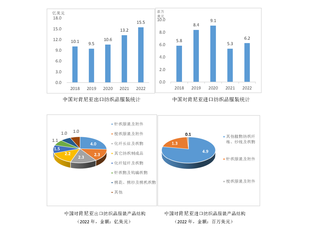 肯尼亞國家統(tǒng)計(jì)局?jǐn)?shù)據(jù)顯示,2022年肯尼亞紡織品服裝出口總額為5.1億美元,其中紡織品出口額為1.1億美元,服裝出口額達(dá)到4億美元,主要出口產(chǎn)品為梭織服裝及附件(占比45%)、針織服裝及附件(占比34%)。同期紡織品服裝進(jìn)口總額為10.4億美元,主要進(jìn)口產(chǎn)品為化纖短纖及織物(占比18%)、針織物及鉤編織物(占比13%)、化纖長絲及織物(占比10%)等。