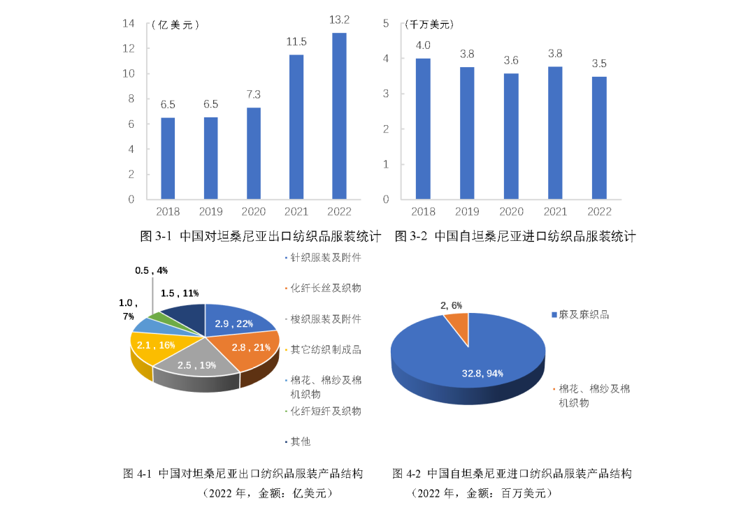 中國于1964年與坦桑尼亞建交,2022年兩國建立全面戰(zhàn)略合作伙伴關(guān)系。中國是坦桑尼亞第一大貿(mào)易伙伴、第一大外資來源國,2022年,中坦雙邊貿(mào)易額為83.1億美元。中國是坦桑尼亞重要的紡織品服裝貿(mào)易伙伴,為坦桑尼亞提供服裝產(chǎn)品和少許面料,坦桑尼亞為中國提供少許劍麻和棉花原料。根據(jù)中國海關(guān)統(tǒng)計,2022年,中國與坦桑尼紡織品服裝進出口總額為16.7億美元,其中,中國對坦桑尼亞出口額為13.2億美元,主要出口產(chǎn)品為針織服裝(占比22%)、化纖長絲及織物(占比21%)、梭織服裝(占比19%)等;自坦進口額為3.5億美元,進口產(chǎn)品僅有麻及麻織品(占比94%),棉花、棉紗及棉機織物(6%)。