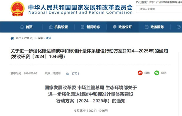 ?8月8日,國家發展改革委、市場監管總局、生態環境部發布《關于進一步強化碳達峰碳中和標準計量體系建設行動方案(2024—2025年)》。