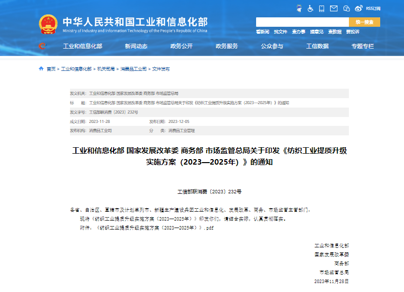 近日工業和信息化部、國家發展改革委、商務部、市場監管總局等四部門聯合印發《紡織工業提質升級實施方案(2023—2025年)》。