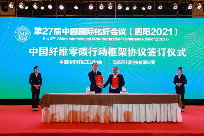 在第27屆中國國際化纖會議(泗陽2021)現場,中國化學纖維工業協會推出可持續推動“雙碳”目標落實的新活動:中國化學纖維工業協會???江蘇芮邦科技有限公司???中國纖維零碳行動(簡稱芮邦???中國纖維零碳行動)框架協議簽約。