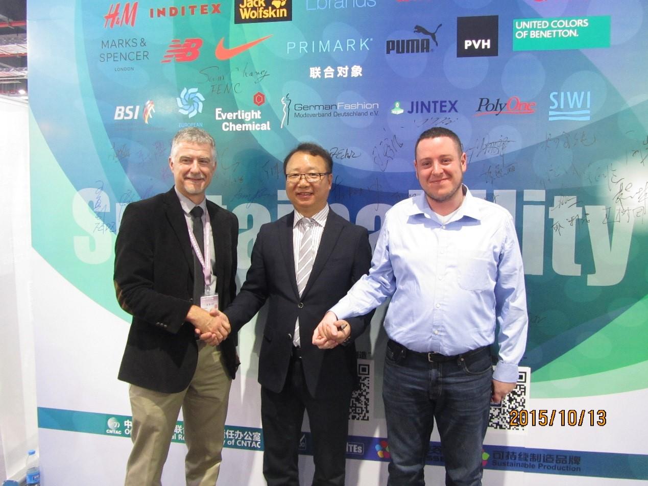 行業(yè)領(lǐng)導(dǎo)在了解“科技創(chuàng)新社會責(zé)任”主題后與ZDHC全球技術(shù)總監(jiān)Scott Echols,C&A全球可持續(xù)化學(xué)采購負(fù)責(zé)人Adam及Adidas,ZARA等國際品牌代表一起簽名,為行業(yè)點(diǎn)贊綠色制造。