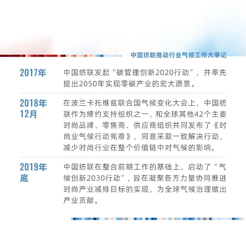 2021年6月,中國(guó)紡聯(lián)啟動(dòng)了“中國(guó)時(shí)尚品牌氣候創(chuàng)新碳中和加速計(jì)劃”(以下簡(jiǎn)稱(chēng)“30·60碳中和加速計(jì)劃”),篩選一批中國(guó)紡織服裝行業(yè)競(jìng)爭(zhēng)力500強(qiáng)企業(yè)優(yōu)先支持30家重點(diǎn)品牌企業(yè)和60家重點(diǎn)制造企業(yè)開(kāi)展氣候創(chuàng)新行動(dòng),并引導(dǎo)重點(diǎn)產(chǎn)業(yè)集群氣候創(chuàng)新行動(dòng)碳中和先行示范。“30·60碳中和加速計(jì)劃”是氣候創(chuàng)新2030行動(dòng)的一部分,更加強(qiáng)調(diào)行動(dòng)落實(shí)和進(jìn)展公示,要求參與企業(yè)必須承諾在簽署后6個(gè)月內(nèi)開(kāi)展氣候創(chuàng)新訓(xùn)練營(yíng),12個(gè)月內(nèi)開(kāi)展公司碳排放基線測(cè)量工作,制定并執(zhí)行氣候行動(dòng)規(guī)劃,24個(gè)月內(nèi)公布?xì)夂蛐袆?dòng)目標(biāo)或路線圖,并按年度報(bào)告組織溫室氣體排放情況。