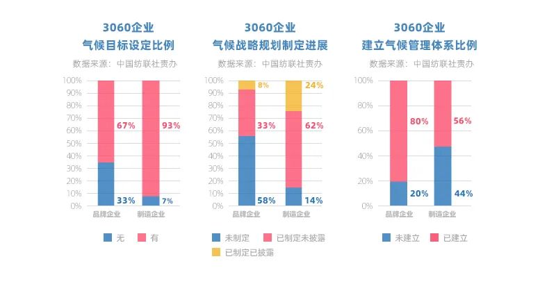 隨著國(guó)家推動(dòng)并建立綠色低碳相關(guān)工廠與產(chǎn)品等評(píng)價(jià)方法,紡織企業(yè)積極響應(yīng),錨定產(chǎn)業(yè)轉(zhuǎn)型新機(jī)遇,3060企業(yè)已有27%完成開(kāi)發(fā)低碳/零碳相關(guān)試點(diǎn)/示范項(xiàng)目。