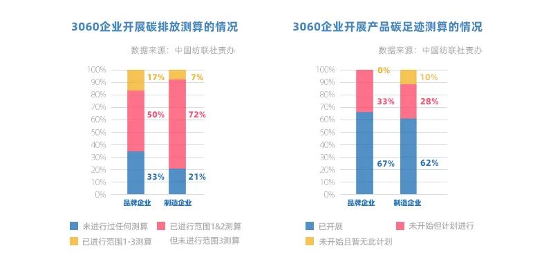 在組織層面的溫室氣體排放量測(cè)算上,企業(yè)大部分已開(kāi)始對(duì)自身運(yùn)營(yíng)范圍(即范圍1&2)的排放進(jìn)行測(cè)算,小部分領(lǐng)先企業(yè)已進(jìn)行全價(jià)值鏈排放(即范圍1-3)的測(cè)算。超半數(shù)已進(jìn)行產(chǎn)品碳足跡測(cè)算。