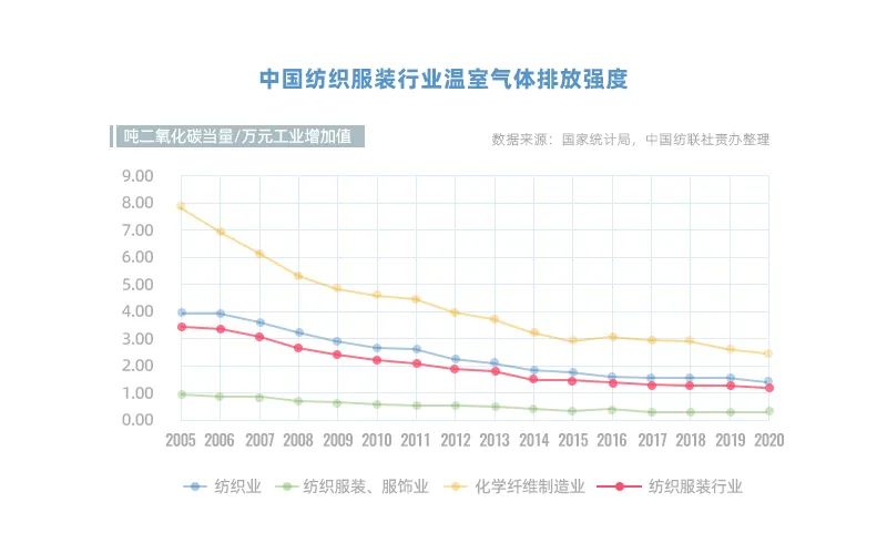 02 行業(yè)氣候行動(dòng)進(jìn)展 中國(guó)紡織服裝行業(yè)年排放量大約在2.3億噸左右,2020年排放總量約為2.09億噸。行業(yè)排放量約占全國(guó)排放量的2%,占全國(guó)工業(yè)排放量的2.8%,因此與其他行業(yè)相比,紡織服裝行業(yè)整體排放水平不高。而根據(jù)國(guó)際能源署統(tǒng)計(jì),2019年全球紡織和皮革業(yè)排放在2.99億噸左右,占全球排放量的0.6%,因此,中國(guó)作為全球紡織服裝產(chǎn)業(yè)和消費(fèi)大國(guó),中國(guó)紡織服裝行業(yè)肩負(fù)重大使命,其氣候行動(dòng)和進(jìn)展將極大推動(dòng)全球時(shí)尚行業(yè)綠色轉(zhuǎn)型。