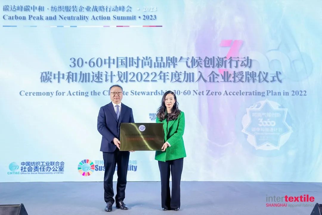 會(huì)上舉行了30·60中國時(shí)尚品牌氣候創(chuàng)新行動(dòng)碳中和加速計(jì)劃2022年度加入企業(yè)授牌儀式。孫瑞哲為鄂爾多斯、卡賓服飾、達(dá)利中國、廣東兆天的企業(yè)代表頒發(fā)牌匾。