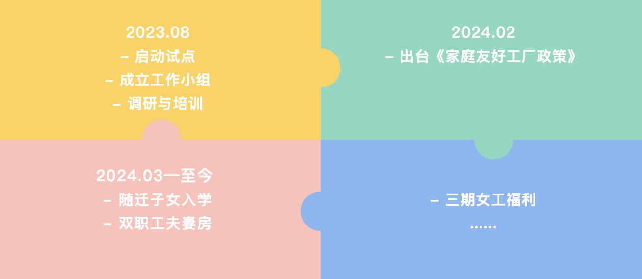 2024年2月,企業出臺了《家庭友好政策》,將家庭友好制度融入企業社會責任管理和可持續發展體系;2024年3月,修訂完善了多項FFF項目相關的規章制度,該制度涵蓋員工隨遷子女入學、雙職工夫妻房、三期女工福利、平等對待男女職工、反騷擾和反歧視保護、薪酬福利以及帶薪休假七項主題,全方位保障員工福祉。