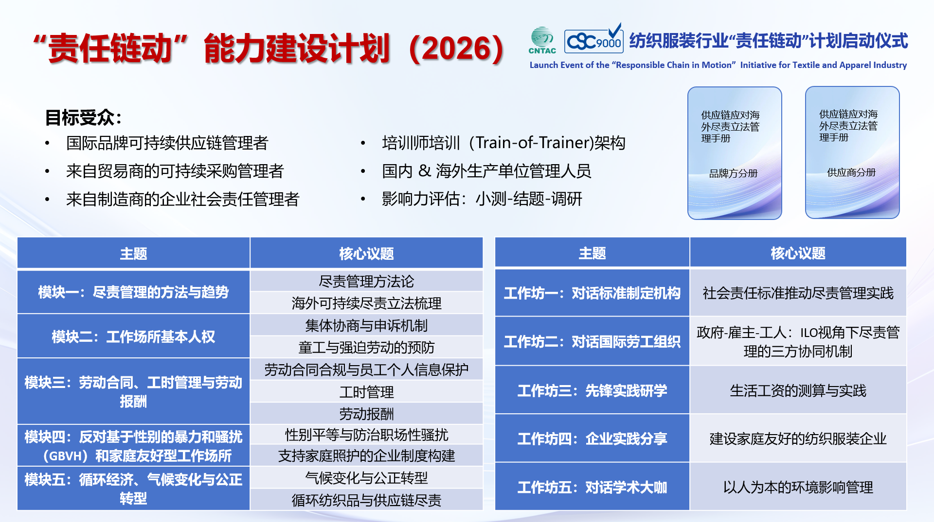 2026年3月11日,由中國紡織工業聯合會社會責任辦公室主辦的“共擔·共治·共贏:紡織服裝行業‘責任鏈動’計劃啟動儀式”在上海國家會展中心成功舉行。來自國際組織、品牌企業、供應商及行業機構的代表齊聚一堂,圍繞全球供應鏈盡責管理趨勢、本土實踐與協同共治展開深入探討,共同見證“責任鏈動”計劃正式啟航。