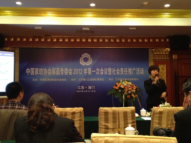 中國家紡協會床上用品專業委員會2012年第一次會議于4月17-18日在江蘇海門光華國際大酒店隆重召開。作為會議重要內容之一,18日下午特別舉辦了家紡企業社會責任培訓講座,有近60名全國家紡行業企業負責人參加
