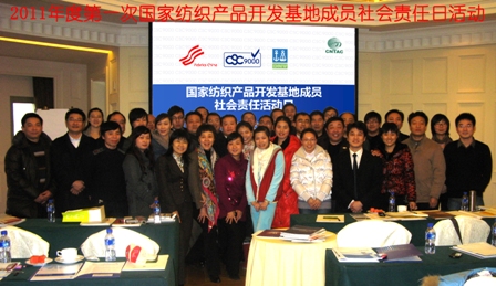 2011年1月5日,國家紡織產(chǎn)品開發(fā)基地秘書處聯(lián)合中國紡織工業(yè)協(xié)會社會責(zé)任辦公室、挪威船級社DNV共同舉辦了首期“國家紡織產(chǎn)品開發(fā)基地企業(yè)社會責(zé)任活動日”活動,來自近24家國家紡織產(chǎn)品開發(fā)基地企業(yè)的
